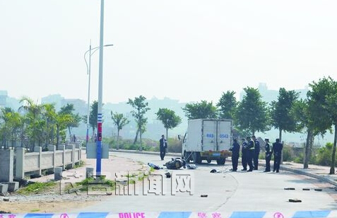 记者赶到现场,警察已拉起警戒线,并对江东北路实行临时交通管制。记者在警察的劝阻下,无法接近事故现场拍摄及了解情况。记者远远观察到,一辆往钟鼓桥方向行驶的厢式货车停在路边,在马路的另一侧,一辆摩托车倒在路边,车头向着钟鼓桥方向,一具男尸仰面倒在路面上,血肉模糊,头部向着官渡桥方向,数名交警正在现场认真地勘查。由于记者及其他市民不能接近现场,所有的细节只有交警知晓。